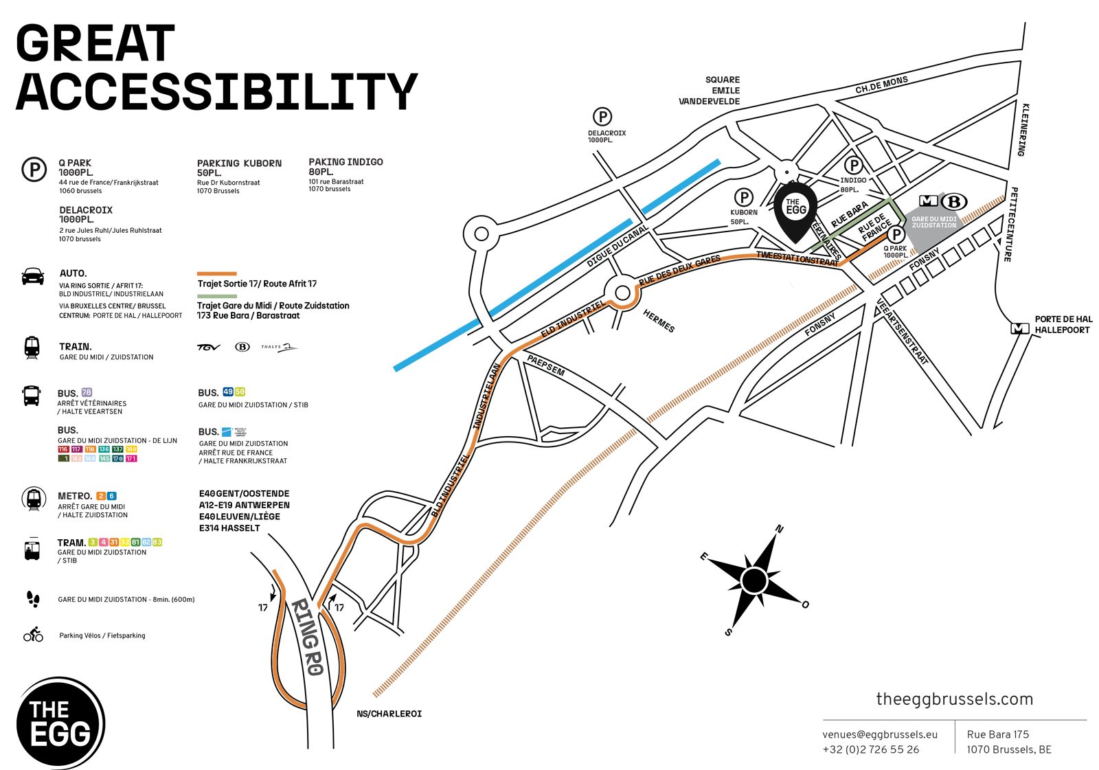 Depuis la Gare du Midi (Sortie N°2), (Direction CERIA) ou (Direction Humanité) descendre à l’arrêt Vétérinaire qui est juste devant The EGG.